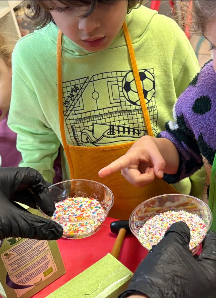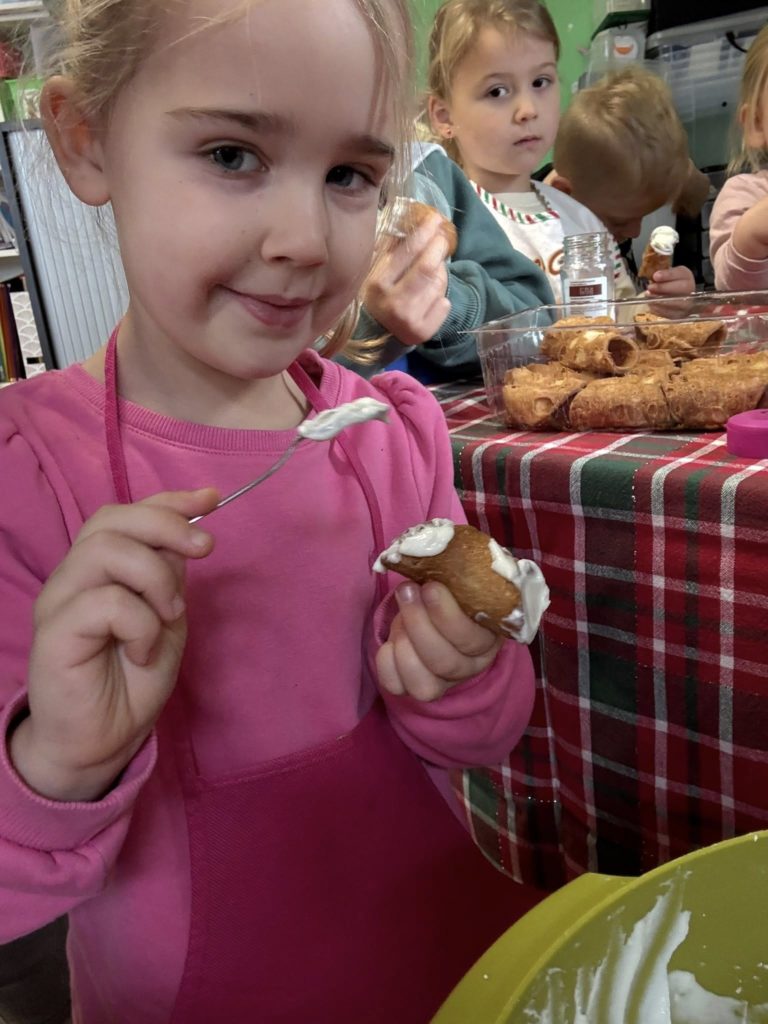 Dans le cadre de notre « voyage » en Italie, nous, les maternelles, avons eu la chance de recevoir la visite de Lilo, qui a cuisiné avec nous de délicieux cannolis.