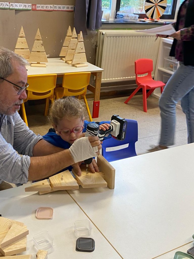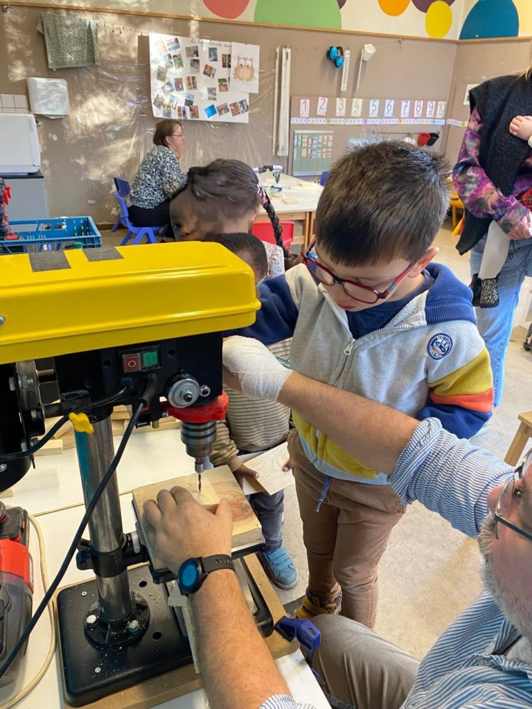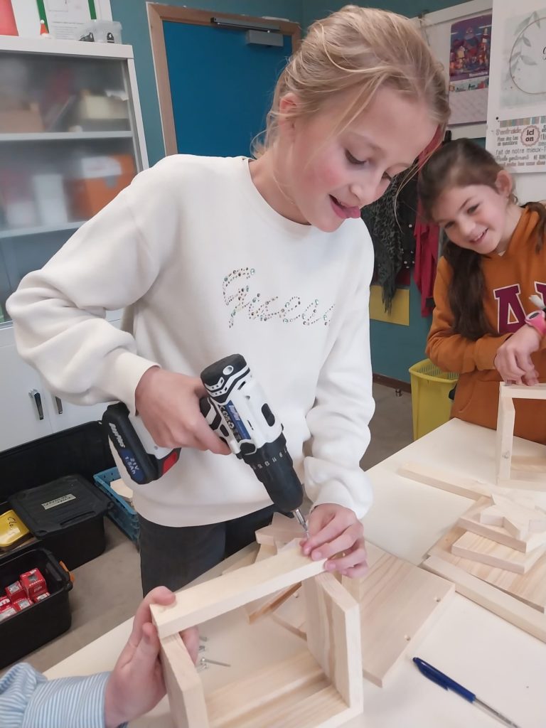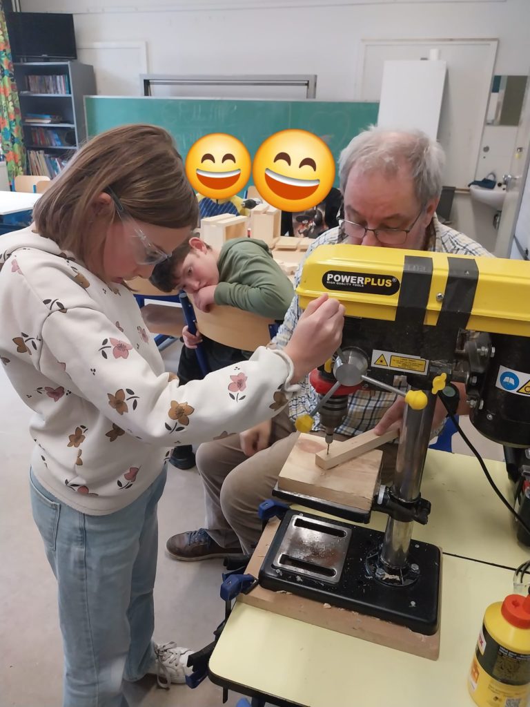 Quelques explications sur la provenance du bois, un rappel des règles de sécurité et nous voilà quelques minutes plus tard, déjà en pleine action : poncer, visser, coller, forer, réajuster,… toujours le sourire aux lèvres bien sûr !